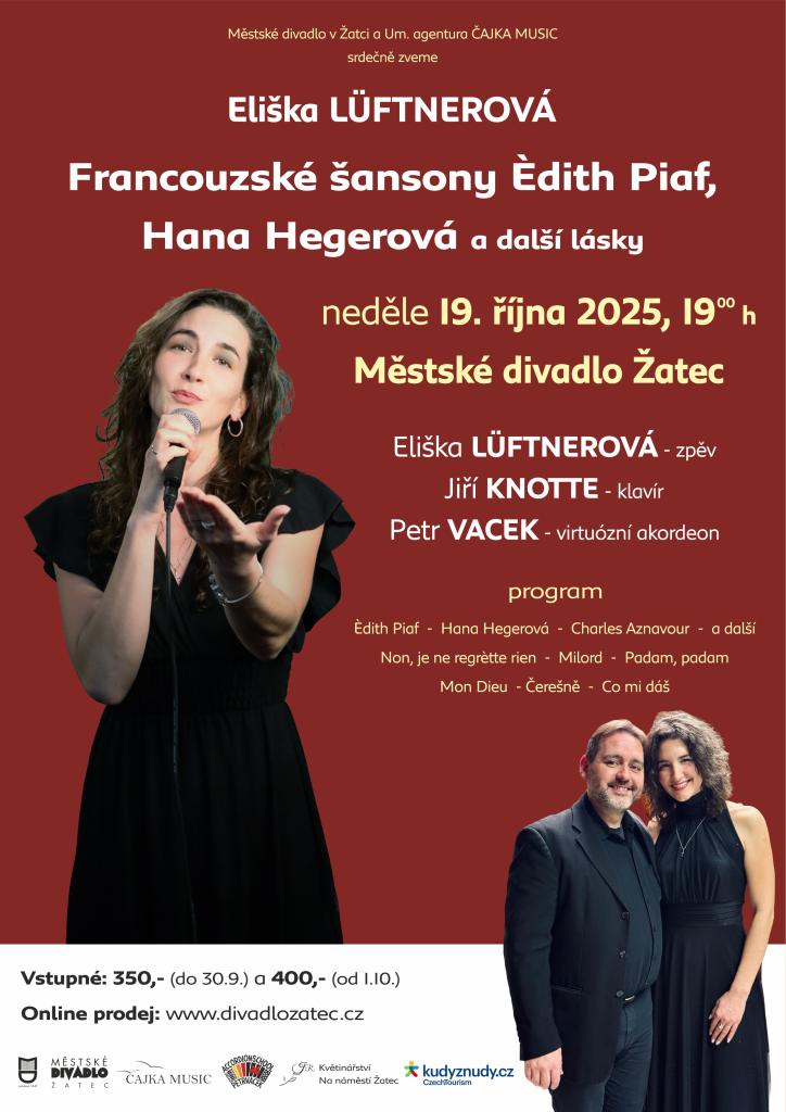 Skladbami jako Non, je ne regrette rien, Milord, Mon Dieu, Padam Padam a mnohými dalšími včetně Čerešně, Já ráda vzpomínám či Co mi dáš předává posluchačům svým výjimečně zabarveným hlasem krásu, radost a tajemství francouzských písní. Eliška spolupracuje s legendárním hercem, básníkem a cimrmanologem Miloňem Čepelkou v programu Šansonárium a obdiv i poklonu jí při jejím nedávném koncertě v divadle Semafor přišel na pódium vyjádřit sám ředitel Semaforu, pan Jiří Suchý. Eliška svým zpěvem šansonu od Edith Piaf nadchla i porotu finále soutěže Česko Slovensko má talent, a to včetně přísného Jaro Slávika. Její neopakovatelný sametový hlas s tajemným podtónem nás přenese do sladké Francie přímo na bulváry Paříže a slibuje výjimečný a nezapomenutelný zážitek. Sympatickou mladou šansoniérku Elišku, již dnes přezdívanou "Česká Piaf" doprovodí skvělý klavírista a mistr klavírní improvizace Jiří Knotte. Na akordeon se připojí náš přední akordeonový virtuoz Petr Vacek, který francouzskou hudbu pro akordeon studoval přímo ve Francii. Máme se opravdu na co těšit, čeká nás krásný koncert v podání milých mladých hudebníků - koncert s mnoha úsměvy, radostí a spontánní atmosférou.