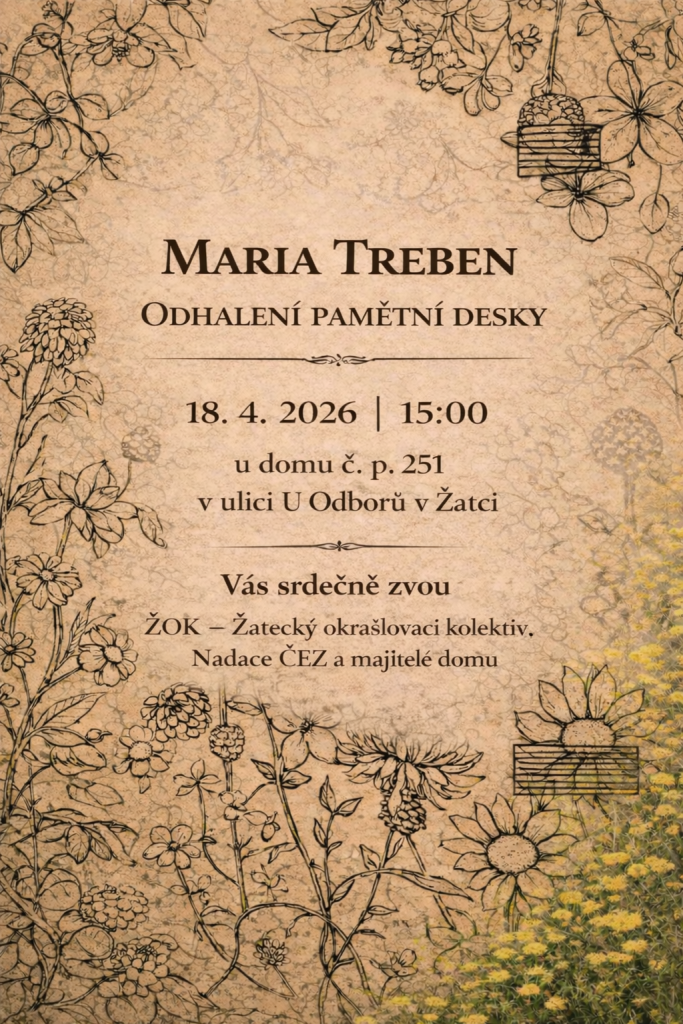 Žatecký okrašlovací kolektiv z.s. Vás zve na slavnostní odhalení pamětní desky známé bylinkářce a spisovatelce, žatecké rodačce, Marii Treben, které se koná v sobotu 18. dubna od 15 hodin před domem č. p. 251 v ulici U Odborů. Pamětní deska bude odhalena na domě, ve kterém její otec provozoval svou tiskařskou dílnu. Náklady na výrobu a umístění pamětní desky pokryla svým grantem Nadace ČEZ.