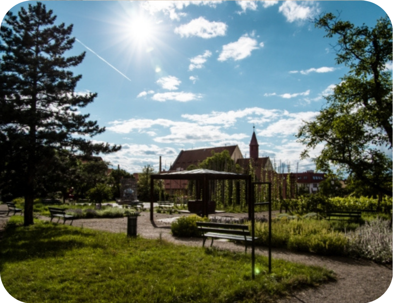Klášterní zahrada, která původně sloužila nejen k meditacím, ale i jako užitková plocha prošla v letech 2009–2011 rozsáhlou rekonstrukcí. Dnes zahrada nabízí klidné místo k odpočinku. V horní části zahrady se nachází historická tyčová chmelnice, bylinková zahrádka, vinice a fontána. Ve spodní části naleznete dominanty, jako kašnu Chmelových rytířů, sochu Boreše - strážce města, ptačí voliéry a domov dalších zde chovaných zvířat.